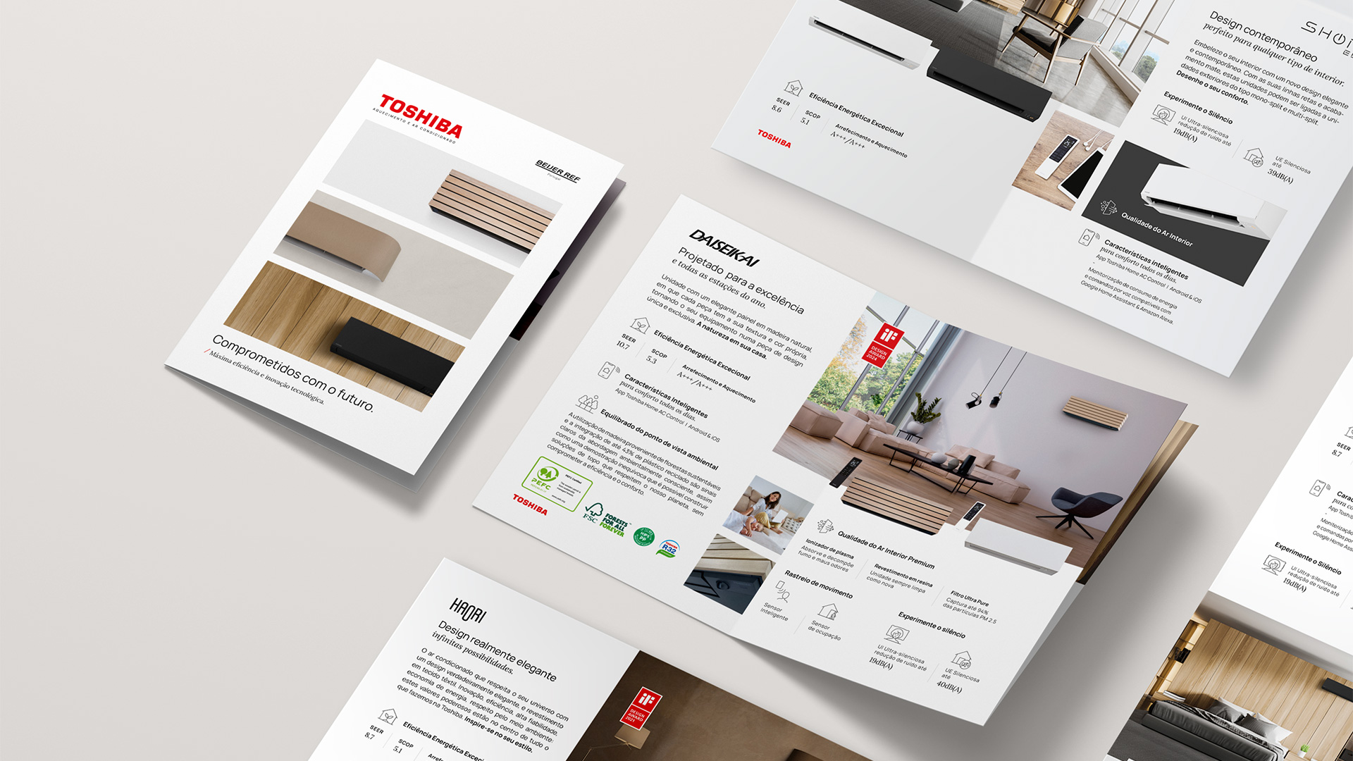 Os suportes promocionais ao serviço das marcas na divulgação dos seus produtos, como o caso deste desdobrável, são bastante flexíveis e funcionam em diferentes contextos profissionais. Um formato prático com informações essenciais para a apresentação e divulgação da Toshiba Aquecimento e Ar Condicionado em contexto de feira ou nas relações profissionais da marca.